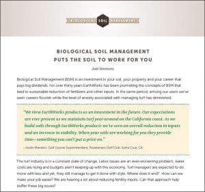 Please take a look through our “White Papers” section where we recently published a paper entitled “Biological Soil Management Puts The Soil To Work For You.” This paper is an overview of the work that we have been dedicated to for the past thirty years. This work has helped so many clients and friends cut their days a little shorter and take away some of the anxiety that the job can create. Please read it in good health and share it with someone who you think may find it of value to their career.