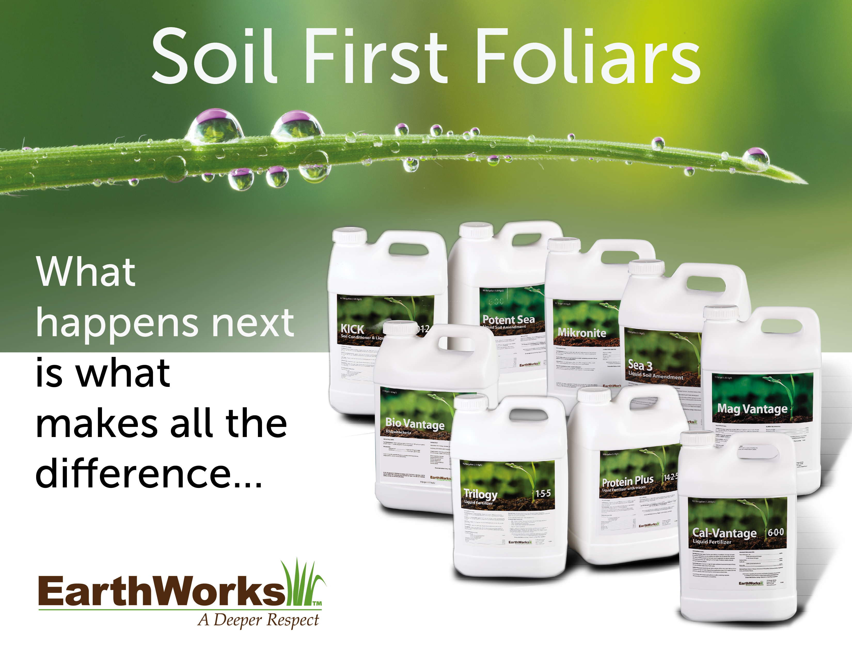 The Soil First Foliars are the first liquid products in the industry that feed not only the plant, but maybe more importantly, they feed the soil. The EarthWorks 555 program uses five ounces per thousand square feet of turf of three products:
